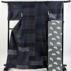 美品 付下げ 身丈173cm 裄丈68.5cm L 袷 赤城紬 草木染工房 落款あり 証紙あり 幾何学 格子 墨色 正絹 逸品 中古