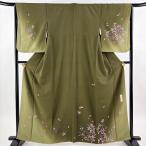 付下げ 身丈161.5cm 裄丈65cm M 袷 辻村ジュサブロー 落款あり 撫子 ぼかし 縮緬 茶緑色 正絹 逸品 中古