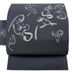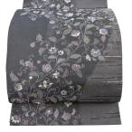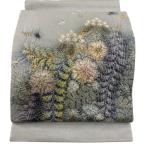袋帯 逸品 洛陽織物 落款あり 紫根染 花唐草 銀糸 灰色 六通 正絹 中古