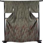 付下げ 身丈163cm 裄丈66cm M 袷 洗える着物 葉柄 霞 灰緑 化繊 秀品 中古