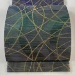 名古屋帯 美品 逸品 城間栄順 落款あり 糸巻き 葉 縮緬 青灰色 正絹 中古