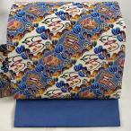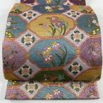 袋帯 逸品 草花 立涌 金糸 青灰色 お太鼓柄 正絹 中古