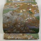 袋帯 美品 逸品 草花 動物 刺繍 金銀糸 緑 全通 正絹 中古
