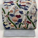 美品 袋帯 逸品 夏帯 草花 箔 刺繍 灰紫 六通 正絹 中古