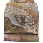 美品 袋帯 逸品 となみ織物 はくば錦 華文 花唐草 金糸 金彩 ベージュ 六通 正絹 中古