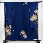 美品 振袖 身丈156cm 裄丈67.5cm L 袷 桜 草花 金彩 箔 紺色 正絹 秀品 中古