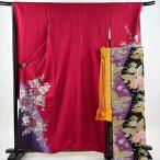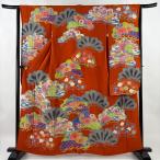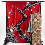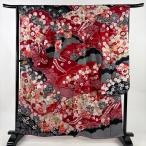 美品 振袖 身丈170cm 裄丈67.5cm L 袷 御所車 草花 刺繍 絞り 赤 正絹 秀品 中古