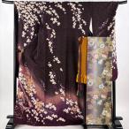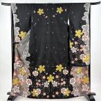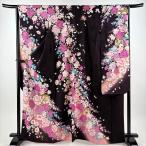 美品 振袖 身丈166cm 裄丈67.5cm L 袷 桜 花びら 染め分け 黒 正絹 秀品 中古