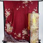 美品 振袖 身丈170.5cm 裄丈72.5cm L 袷 牡丹 菱 ラメ 金彩 えんじ色 正絹 秀品 中古