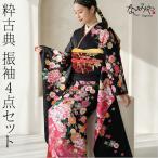 正絹 着物 セット 袷用 正絹 振袖 黒 古典柄 袋帯 帯揚げ 帯締め 4点セット 仕立て上がり レトロ モダン レディース