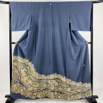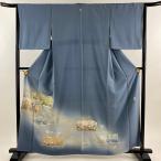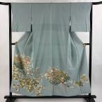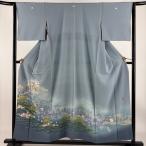 色留袖 身丈154cm 裄丈64cm M 袷 落款あり 枝花 建物 青灰色 正絹 秀品 一つ紋 中古