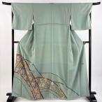 色留袖 身丈161cm 裄丈66.5cm M 袷 扇面 宝尽くし 金銀彩 ぼかし 灰緑 正絹 秀品 一つ紋 中古