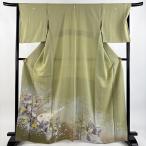 色留袖 身丈166cm 裄丈64cm M 袷 柿本市郎 落款あり 樹木 波 鶯色 正絹 秀品 五つ紋 中古