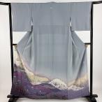 色留袖 身丈154.5cm 裄丈65cm M 袷 阿部佳雪 落款あり 松梅 天の橋立 ぼかし 青灰色 正絹 秀品 三つ紋 中古