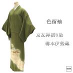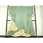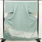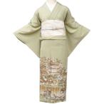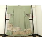 中古 色留袖 五つ紋付き 比翼付き 縮緬 正絹 古典柄 袷仕立て 身丈162.5cm 裄丈66.5cm 着物 緑・うぐいす色