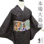本場大島紬 着物 正絹 袷 友原織物 9マルキ カタス式 濃茶グレー 灰紫 草花 中古 仕立て上がり 身丈161 裄丈67 Mサイズ みやがわ sb15963