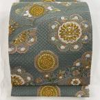 袋帯 逸品 草花 立涌 金糸 青灰色 お太鼓柄 正絹 中古