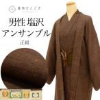 着物 羽織 アンサンブル 男性 本場塩沢紬 身丈142.5cm M 裄68cm 仕立て上がり リサイクル着物 手織り クリーニング済 茶色系 角帯 羽織紐付き ttc2560a40