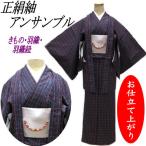 【お仕立て上がり】 着物 羽織 正絹 紬 アンサンブル 羽織紐 3点セット 新品 格子柄 絹 きもの 小紋 レディース 普段着 和服 黒地 縞柄