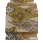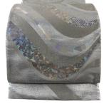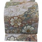 袋帯 秀品 華文 波 箔 金糸 灰白 六通 正絹 中古