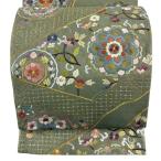 美品 袋帯 逸品 華文 草花 刺繍 金糸 よもぎ色 六通 正絹 中古