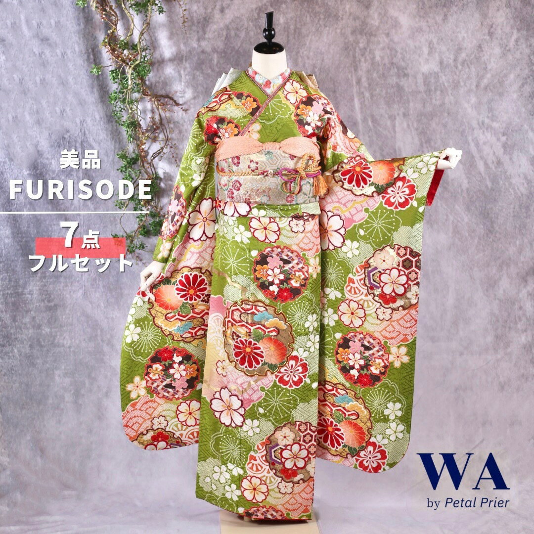 \30%OFF!/【中古】振袖 7点フルセット Lサイズ 振袖セット 振袖フルセット フルセット 成人式 着物 晴れ着 黄緑 緑 古典 古典柄 レトロ 総柄 金駒刺繍 帯 帯揚げ 重衿 半衿 帯締め 結婚式 ブライダル 十三参り F-90