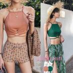 ビキニ レディース パレオ付き3点セット水着 夏 ハイウエスト ショートパンツ リゾート クロスバンド 水着 夏 エスニック柄
