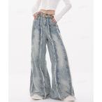 ジーンズ デニム デニムパンツ 韓国ファッション 左右非対称デザインハイウエストワイドデニム レディース
