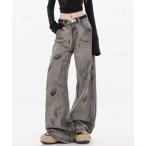 ジーンズ デニム デニムパンツ 韓国ファッション ダメージペイントワイドストレートデニムパンツ レディース メンズ