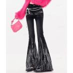 ジーンズ デニム デニムパンツ 韓国ファッション 裾ラインストーンデザインハイウエストフレアデニ レディース