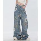 ジーンズ デニム デニムパンツ 韓国ファッション フラワープリントワイドストレートデニムパンツ レディース