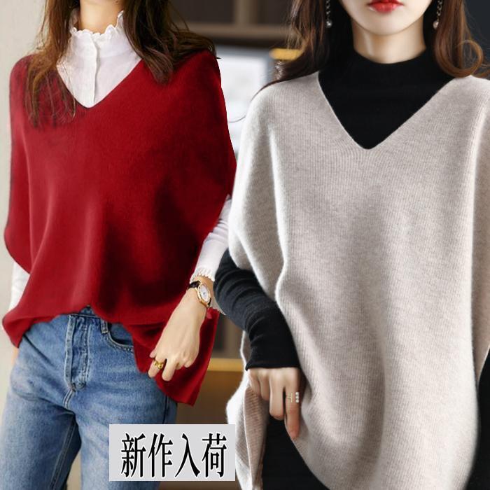 Vネックニットトップス半袖ドルマン体型カバーレディース秋冬春おしゃれきれいめシンプル着回し大人可愛い無地ゆったり