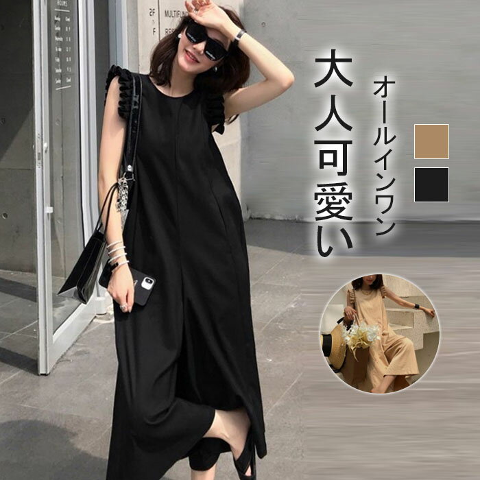 オールインワン レディース ワイドパンツ ガウチョパンツ フリル 綿混 ロング丈 9分丈 無地 トレンド 体型カバー シンプル カジュアル ビッグシルエット 20代 30代 40代 50代 大人可愛い 送料無料
