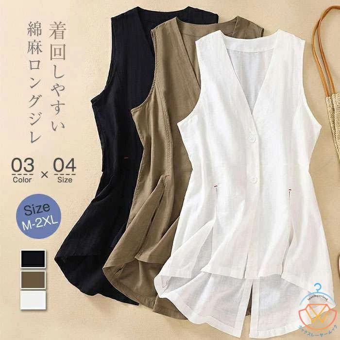 袖なし ベスト ノースリーブ 麻 綿 レディース Vネック 前開き