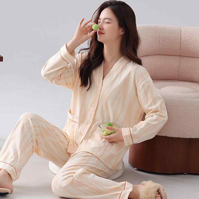 パジャマ レディース 綿100% ゆったり Vネック 開襟 長袖 ロングパンツ シンプル 春秋 ルームウェア 部屋着 外着可能 セットアップ 快適 リラックス