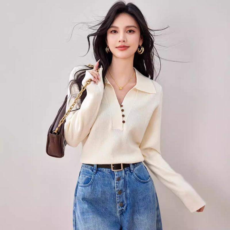 ニット レディース 秋冬 フレンチシック 上品 きれいめカジュアル ポロ襟 切り替え ボタン ハーフボタン デザイン性 プルオーバー 綿混 ストレッチ 長袖 ゆったり セーター トップス アプリコット オフィス 通勤
