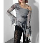 tシャツ 「jiasecond.」プリントシアーフリルアシメトップス / カットソー メッシュ アシンメトリー 長袖 薄手 ワンショル プリント グ