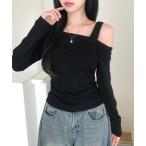 【26%OFF 2,990→2,200円】Tシャツ カットソー ベロア ベルベット アシンメトリー アシメ デコルテ 長袖 ストラップ シャイニー トレンド モード Y2K 韓国 かわいい おしゃれ レディース トップス 大人 SS AW 春 秋 冬 mt07148[moment+/モーメントプラス]
