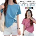 Tシャツ レディース 半袖 カットソー 変形 アシンメトリー 着痩せ リット 無地 シンプル カジュアル おしゃれ Uネック ラウンドネック トップス 春 夏 洗える