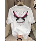 ユニセックス ヘビーウェイトTシャツ 蝶と翼プリント オーバーサイズ アシンメトリーヘム 半袖 クルーネック カジュアル オールシーズン S-3XL