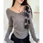 tシャツ チェック柄 リボン付き アシンメトリー リブ ニット トップス レディース