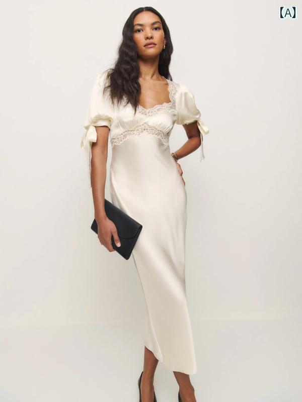 レディース トップス Tシャツ リフォーメーション シルクドレス スクエアネック パフスリーブ タイ レース ミディ スカート