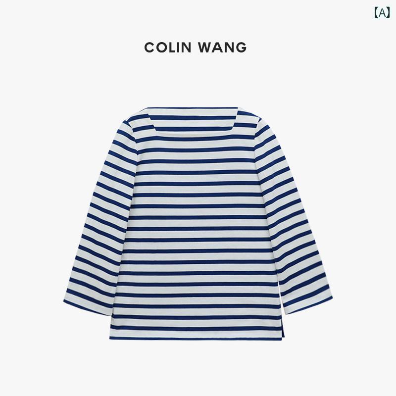 レディース トップス カジュアル おしゃれ レトロ 米国 コットン ネイビー ストライプ スクエアネック Tシャツ スリム 爽やかに