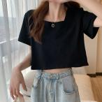 スクエアネックセクシー半袖Tシャツ女夏ゆったりデザインショート丈トップス★t9