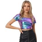 Allegra K Tシャツ クロップトップ スクエアネック 半袖 シャイニー トップ メタリック レディース ブルーパープル S