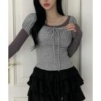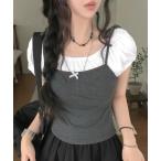 tシャツ レイヤード風 リボン キャミソール ドッキング パフ スリーブ トップス レディース