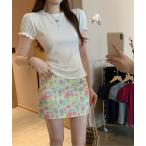 5color トップス Tシャツ ショート丈 パフスリーブ ラウンドネック 細身 スリム シフォン 綿 コットン シンプル カジュアル キュート ピンク ホワイト グリーン オレンジ ブラック 黒 無地 オフィス 通勤 学生 通学 デート 女子会