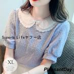 ブラウス トップス シャツ Tシャツ レディース 夏 大きいサイズ 半袖 襟付き フリル 花柄 ガーリー フェミニン クルーネック パフスリーブ ブルー ホワイト イベ
