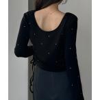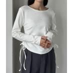 tシャツ サイドギャザーラインストーン飛ばしプレート付Tシャツ レディース