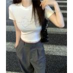 tシャツ ラインストーン ハート ロゴデザイン スリムフィット Tシャツ 短丈 チビT レディース